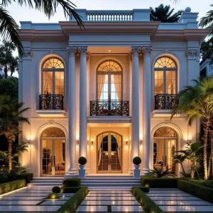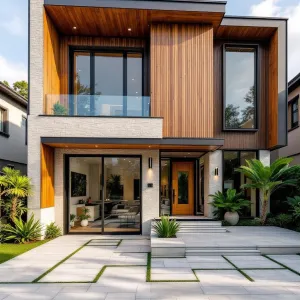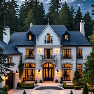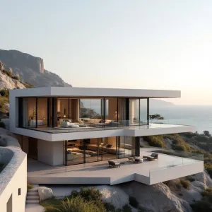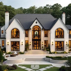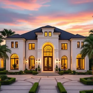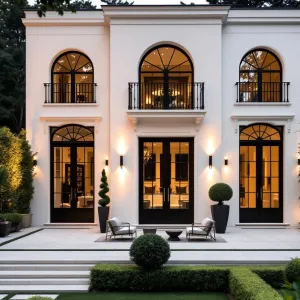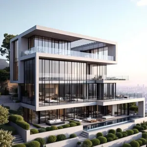 Modern house with large windows and stylish outdoor space, gleaming at dusk